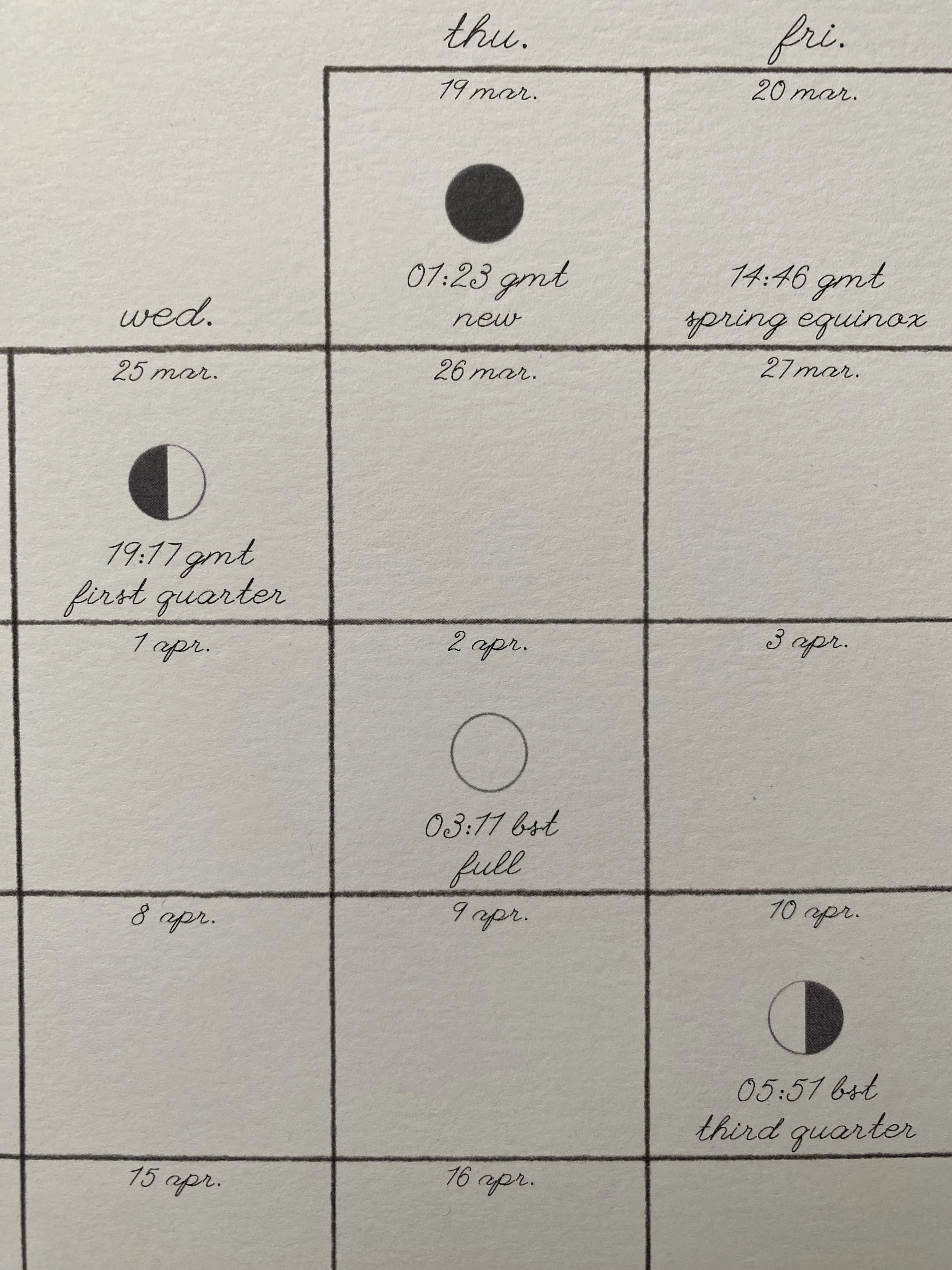 shop Categories: Select a Category cards calendars shop cards | calendars | 2026 lunations calendar - US version $31.00 2026 lunations calendar - UK version $31.00 lunation cards - square - set of 6 Sale Price: $18.00 Original Price: $22.00 Sale lunation cards - pano - set of 8 Sale Price: $20.00 Original Price: $28.00 Sale lunation cards - large - A5 - set of 8 Sale Price: $20.00 Original Price: $28.00 Sale free shipping on all items to anywhere in the world